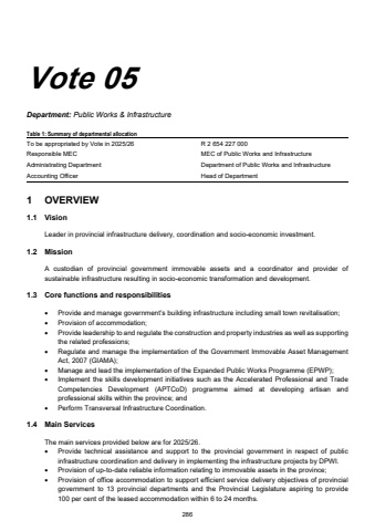 Vote 05 Department: Public Works & Infrastructure Table 1: Summary of departmental allocation To be appropriated by Vote in 2025/26 R 2 654 227 000 Responsible MEC MEC of Public Works and Infrastructure Administrating Department Department of Public Works and Infrastructure Accounting Officer Head of Department 1 OVERVIEW 1.1 Vision Leader in provincial infrastructure delivery, coordination and socio-economic investment. 1.2 Mission A custodian of provincial government immovable assets and a coordinator and provider of sustainable infrastructure resulting in socio-economic transformation and development. 1.3 Core functions and responsibilities %uf0b7 Provide and manage government%u2019s building infrastructure including small town revitalisation;%uf0b7 Provision of accommodation;%uf0b7 Provide leadership to and regulate the construction and property industries as well as supportingthe related professions;%uf0b7 Regulate and manage the implementation of the Government Immovable Asset ManagementAct, 2007 (GIAMA);%uf0b7 Manage and lead the implementation of the Expanded Public Works Programme (EPWP);%uf0b7 Implement the skills development initiatives such as the Accelerated Professional and TradeCompetencies Development (APTCoD) programme aimed at developing artisan andprofessional skills within the province; and%uf0b7 Perform Transversal Infrastructure Coordination.1.4 Main Services The main services provided below are for 2025/26. %uf0b7 Provide technical assistance and support to the provincial government in respect of publicinfrastructure coordination and delivery in implementing the infrastructure projects by DPWI.%uf0b7 Provision of up-to-date reliable information relating to immovable assets in the province;%uf0b7 Provision of office accommodation to support efficient service delivery objectives of provincialgovernment to 13 provincial departments and the Provincial Legislature aspiring to provide100 per cent of the leased accommodation within 6 to 24 months.286