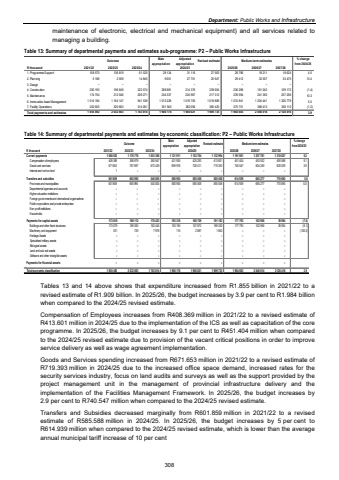 Department: Public Works and Infrastructuremaintenance of electronic, electrical and mechanical equipment) and all services related to managing a building. Table 13: Summary of departmental payments and estimates sub-programme: P2 %u2013 Public Works Infrastructure Outcome Main appropriationAdjusted appropriation Revised estimate Medium-term estimates % change from 2024/25R thousand 2021/22 2022/23 2023/24 2025/26 2026/27 2027/281. Programme Support 136 819 158 570 61 525 28 134 31 116 27 563 28 796 18 211 18 624 4.52. Planning 2 559 5 186 14 845 9 651 27 751 25 947 29 412 32 557 33 475 13.43. Design %u2013 %u2013 %u2013 %u2013 %u2013 %u2013 %u2013 %u2013 %u2013 4. Construction 196 649 250 193 222 574 268 881 214 376 239 604 236 289 161 042 109 172 (1.4)5. Maintenance 212 046 174 754 209 271 234 337 224 967 217 312 239 594 241 350 257 256 10.36. Immovable Asset Management 1 164 147 1 014 184 941 538 1 013 228 1 019 755 1 018 889 1 074 841 1 204 441 1 326 779 5.57. Facility Operations 320 663 252 605 314 061 351 945 382 056 380 420 375 751 388 413 383 110 (1.2)Total payments and estimates 2 032 883 1 855 492 1 763 814 1 906 176 1 900 021 1 909 735 1 984 683 2 046 014 2 128 416 3.92024/25 Table 14: Summary of departmental payments and estimates by economic classification: P2 %u2013 Public Works Infrastructure Outcome Main appropriationAdjusted appropriation Revised estimate Medium-term estimates % change from 2024/25R thousand 2021/22 2022/23 2023/24 2025/26 2026/27 2027/28Current payments 1 080 023 1 176 776 1 053 386 1 131 911 1 153 704 1 132 994 1 191 951 1 257 781 1 318 627 5.2Compensation of employees 408 369 388 879 380 947 431 935 425 293 413 601 451 404 453 532 490 588 9.1Goods and services 671 653 787 897 672 439 699 976 728 411 719 393 740 547 804 249 828 039 2.9Interest and rent on land 1 %u2013 %u2013 %u2013 %u2013 %u2013 %u2013 %u2013 %u2013 Transfers and subsidies 601 859 665 995 540 005 580 955 585 558 585 558 614 939 685 277 770 695 5.0 Provinces and municipalities 601 859 665 995 540 005 580 955 585 558 585 558 614 939 685 277 770 695 5.0Departmental agencies and accounts %u2013 %u2013 %u2013 %u2013 %u2013 %u2013 %u2013 %u2013 %u2013 Higher education institutions %u2013 %u2013 %u2013 %u2013 %u2013 %u2013 %u2013 %u2013 %u2013 Foreign governments and international organisations %u2013 %u2013 %u2013 %u2013 %u2013 %u2013 %u2013 %u2013 %u2013 Public corporations and private enterprises %u2013 %u2013 %u2013 %u2013 %u2013 %u2013 %u2013 %u2013 %u2013Non-profit institutions %u2013 %u2013 %u2013 %u2013 %u2013 %u2013 %u2013 %u2013 %u2013Households %u2013 %u2013 %u2013 %u2013 %u2013 %u2013 %u2013 %u2013 %u2013Payments for capital assets 173 610 190 112 170 423 193 310 160 759 191 183 177 793 102 956 39 094 (7.0)Buildings and other fixed structures 173 079 189 383 162 445 193 195 157 872 189 330 177 793 102 956 39 094 (6.1)Machinery and equipment 531 729 7 978 115 2 887 1 853 %u2013 %u2013 %u2013 (100.0)Heritage Assets %u2013 %u2013 %u2013 %u2013 %u2013 %u2013 %u2013 %u2013 %u2013Specialised military assets %u2013 %u2013 %u2013 %u2013 %u2013 %u2013 %u2013 %u2013 %u2013Biological assets %u2013 %u2013 %u2013 %u2013 %u2013 %u2013 %u2013 %u2013 %u2013Land and sub-soil assets %u2013 %u2013 %u2013 %u2013 %u2013 %u2013 %u2013 %u2013 %u2013Software and other intangible assets %u2013 %u2013 %u2013 %u2013 %u2013 %u2013 %u2013 %u2013 %u2013Payments for financial assets %u2013 %u2013 %u2013 %u2013 %u2013 %u2013 %u2013 %u2013 %u2013Total economic classification 1 855 492 2 032 883 1 763 814 1 906 176 1 900 021 1 909 735 1 984 683 2 046 014 2 128 416 3.92024/25Tables 13 and 14 above shows that expenditure increased from R1.855 billion in 2021/22 to a revised estimate of R1.909 billion. In 2025/26, the budget increases by 3.9 per cent to R1.984 billion when compared to the 2024/25 revised estimate. Compensation of Employees increases from R408.369 million in 2021/22 to a revised estimate of R413.601 million in 2024/25 due to the implementation of the ICS as well as capacitation of the core programme. In 2025/26, the budget increases by 9.1 per cent to R451.404 million when compared to the 2024/25 revised estimate due to provision of the vacant critical positions in order to improve service delivery as well as wage agreement implementation. Goods and Services spending increased from R671.653 million in 2021/22 to a revised estimate of R719.393 million in 2024/25 due to the increased office space demand, increased rates for the security services industry, focus on land audits and surveys as well as the support provided by the project management unit in the management of provincial infrastructure delivery and the implementation of the Facilities Management Framework. In 2025/26, the budget increases by 2.9 per cent to R740.547 million when compared to the 2024/25 revised estimate. Transfers and Subsidies decreased marginally from R601.859 million in 2021/22 to a revised estimate of R585.588 million in 2024/25. In 2025/26, the budget increases by 5 per cent to R614.939 million when compared to the 2024/25 revised estimate, which is lower than the average annual municipal tariff increase of 10 per cent 308